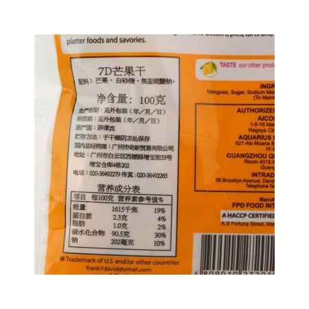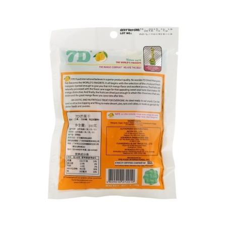 7D芒果干【配料】芒果、白砂糖、焦亚硫酸钠【净含量】100克【原产国】菲律宾【生产日期】见外包装(年/月/日)【贮存条件】于干燥阴凉处保存 7D芒果干生产商早期从事水果收购和销售,于1978年起开始加工芒果干,主要产品有芒果干,芒果汁和芒果蜜饯等。